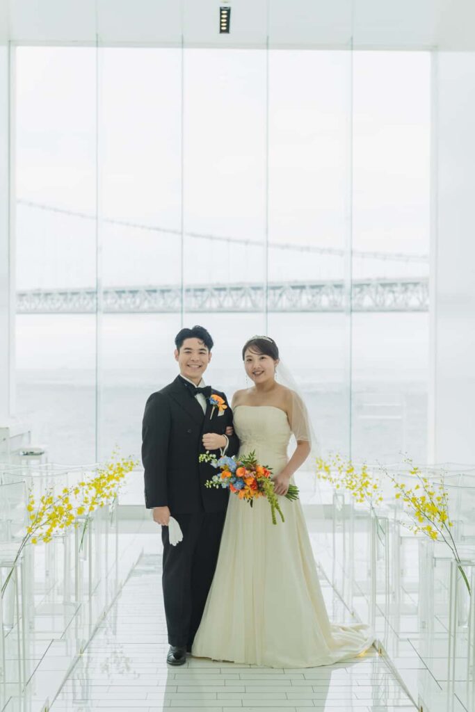オレンジとブルーのブーケがそっと色を添え、おふたりの装いに温かさと爽やかさが重なり、明るく照らしてくれるようです。✨