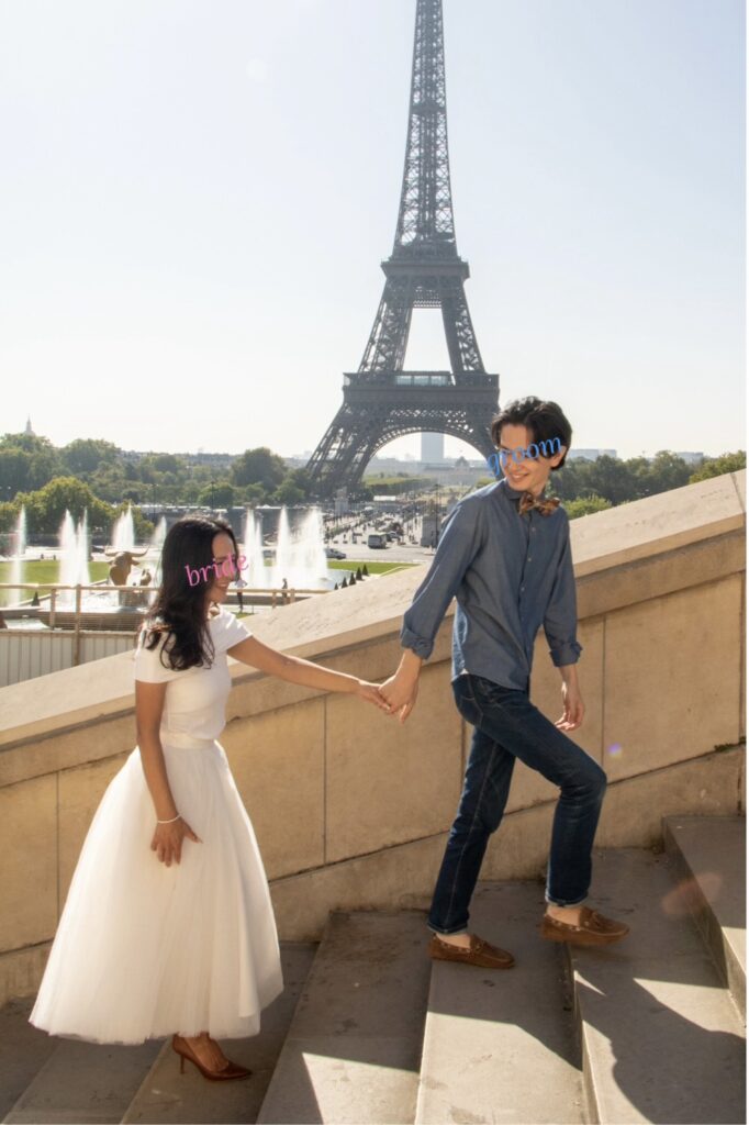 フランス・パリの街並みに溶け込むようなカジュアルなウェディングスタイルは、エッフェル塔と風に揺れるカジュアルなウェディングスタイルがおしゃれで素敵✨